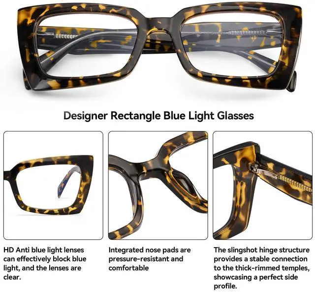 DescriptionUpgrade your daily style with these Womens Black Chunky Square Rectangle Cat Blue Light Glassesa fashion-forward accessory designed for both protection and personality. These bold chunky glasses feature a stylish square-rectangle cat silhouette that enhances your natural features while offering a modern, confident look. Engineered with blue light blocking lenses, they reduce digital eye fatigue during screen time, whether you're working, studying, gaming, or browsing your phone. Lightweight yet durable, these chunky glasses for women deliver the perfect combination of comfort, functionality, and on-trend fashion. A must-have pair of eyeglass frames that elevate any outfit effortlessly.