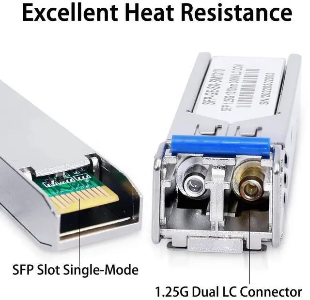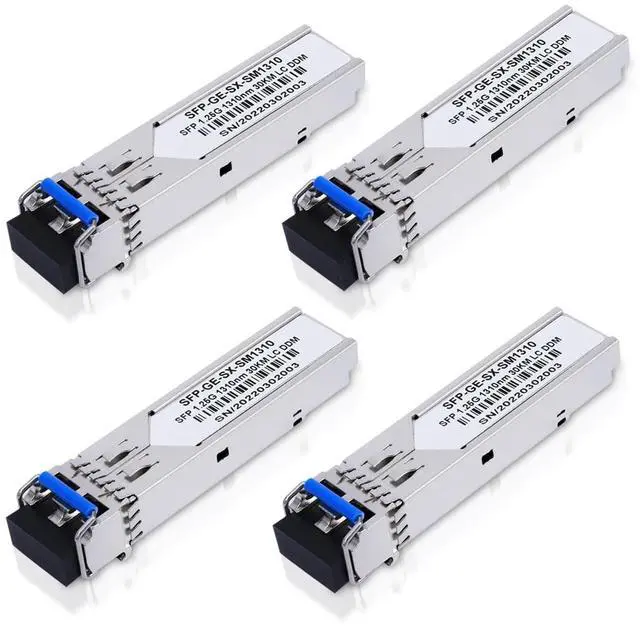 4 PACK 1.25G SFP 1310nm Single-Mode Module SMF 1000Base-LX, Up to 20 km Transceiver. SFP Fiber module is Hot-Swappable with ESD protection making upgrades and replacements seamless by minimizing network disruptions, It is designed for maximum equipment compatibility with SFF-8431, SFF-8432 and IEEE 802.3 ab. Easy installationPlug and Play, Supports hot-pluggable. Rotate the ring latch down at 90 degree angle to unlock, then pulling transceiver out from switch. High-quality metal material of housing, ensuring long life of repeated repeatedly plug and durable. ApplicabilityCompatible with Cisco GLC-LH-SMD, Ubiquiti UniFi, Meraki MA-SFP-1GB-LX10, Fortinet, Mikrotik, TP-Link, Netgear, TL-SM311LS, D-Link, Intel and other open switches, used in 1000BASE networking devices such as fiber switches, routers, network interface cards (NICs), NAS, and 1G media converters.