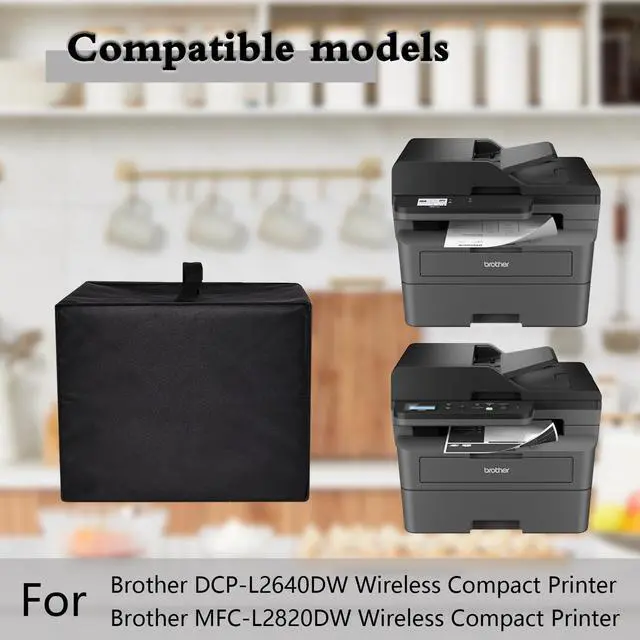 PRINTER COVER SIZEFits printers up to (DWH) 16.9 x 18.1 x 12.6 in (43 x 46 x 32cm) Perfect fit universal dust cover for Brother DCP-L2640DW Wireless Compact Multi-Function Laser Printe/Brother MFC-L2820DW Wireless Compact All-in-One Laser Printer ^^ HIGH QUALITYCrafted from strong and durable 600D nylon material, for Brother printer, Protects your printer from dust and water, preventing particulate lint and moisture vapor from entering and potentially damaging sensitive printer electronics ^^ CONVENIENT DESIGNLightweight one-piece cover design, dust cover has a carrying handle at the top and an open design at the bottom so it can be folded and stored when not in use and takes up little space.