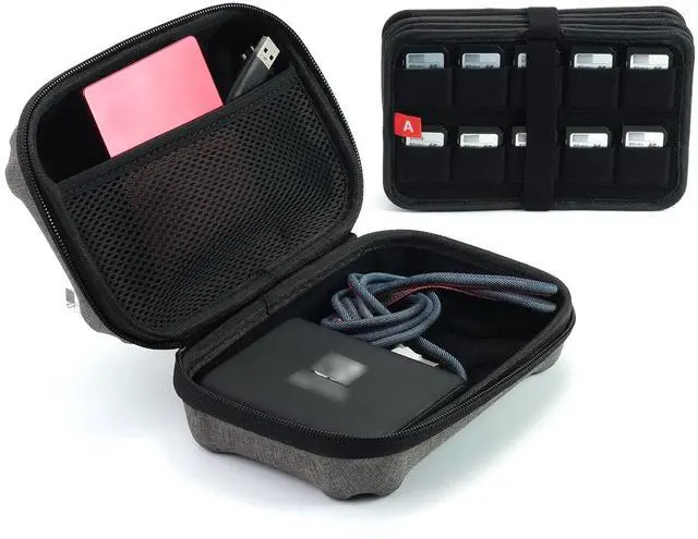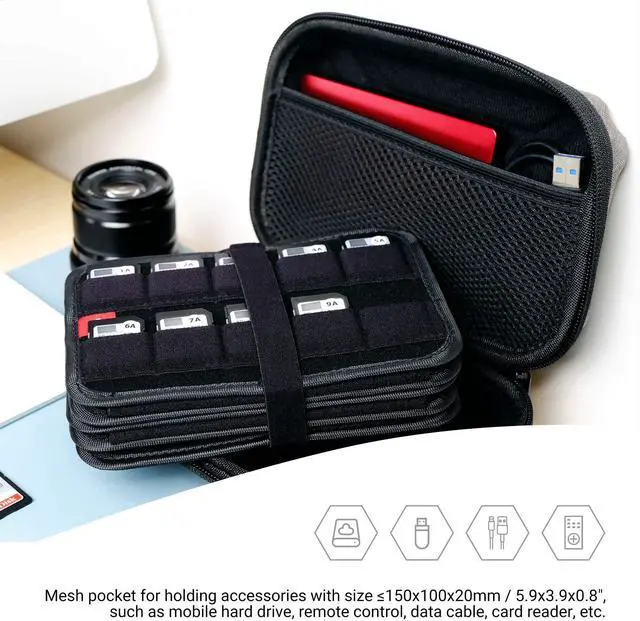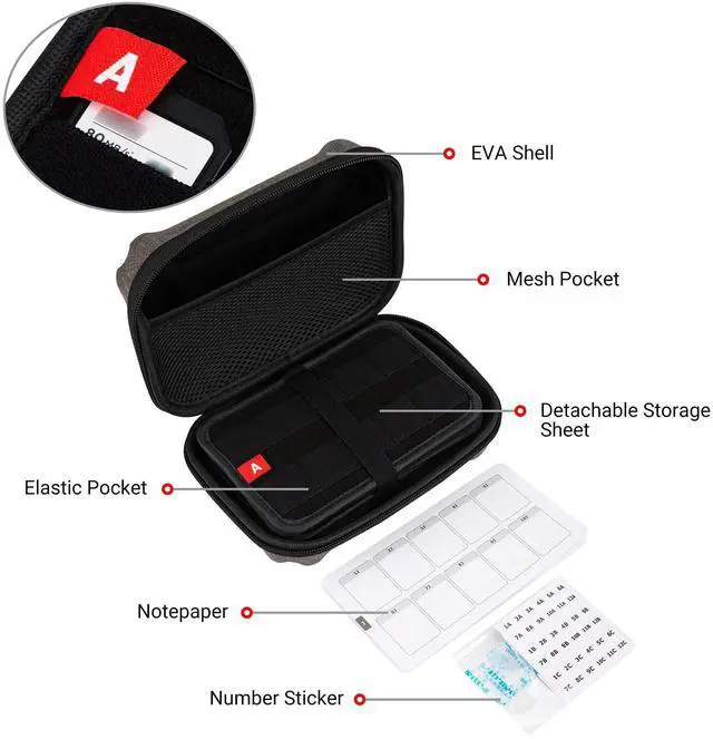 Moreover, the premium & eco-friendly material also can effectively protect your memory cards from dust, shock, and water splashing ^^ [Upgraded Interior Design-Mesh Pocket]- The mesh pocket inside the memory card carrying case allows you to hold accessories with size 150x100x20mm / 5.9 x 3.9 x 0.8", such as a hard drive, Chargers, remote control, data cable, card reader, USB, earbuds, Earphones, and other universal electronic accessories ^^ [Detachable Design]- The detachable design of the storage sheets enables you to store other items in this memory card organizer ^^ [Portable and Practical]- This SD card wallet external dimensions: 195x135x70mm/ 7.68 x 5.31 x 2.76 inches; the all-around zipper is easy to open and close. Everything is easy to put in, take out, and fits securely. In addition, the SD card case holder includes notepaper and number stickers for you to better organize your cards. Perfect for traveling, business trips, and everyday carry
