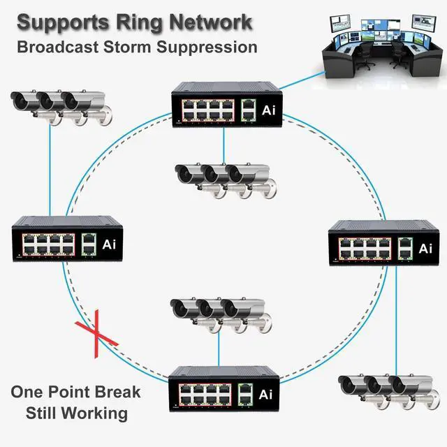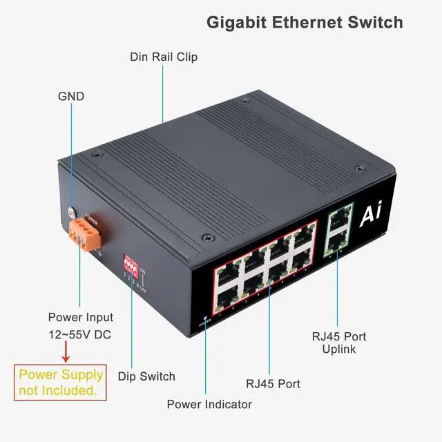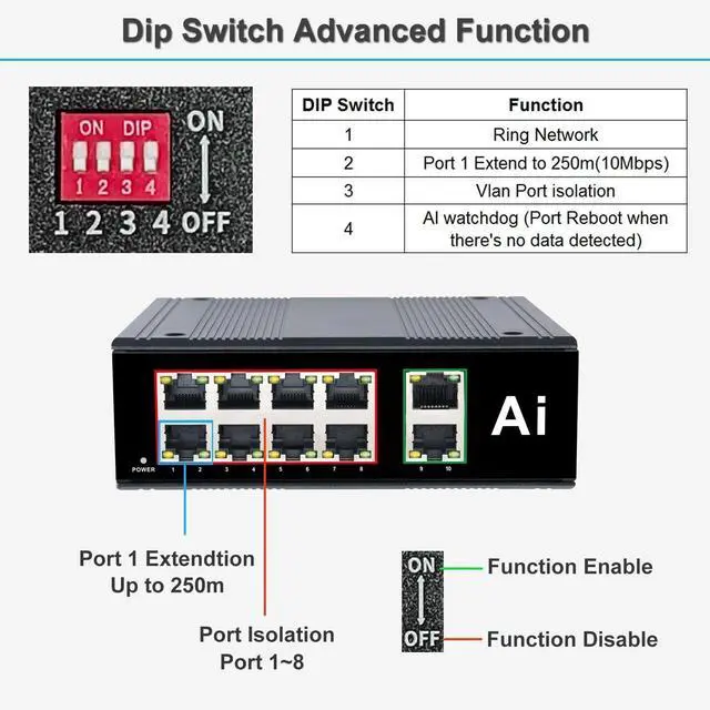 10/100/1000Mbps Ethernet The Industrial 10 ports Ethernet Switch have 10 RJ45 ports 10/100/1000Mbps half/full duplex. ^^ Support Ring Connection The 10 ports Ethernet Switch Supports ring network protection and BSP (Broadcast storm suppression) functions, which are typically only found in expensive managed switches. ^^ Support Port Isolation The DIN-rail Ethernet switch can realize port Port isolation function through dip switch. So the device on each port will not affect each other. ^^ Industrial Grade Quality The Hardened Din-rail Gigabit Switch use industrial grade components and aluminum housing, it can work at wide range temperature -40C to 80C (-40F to 176F).