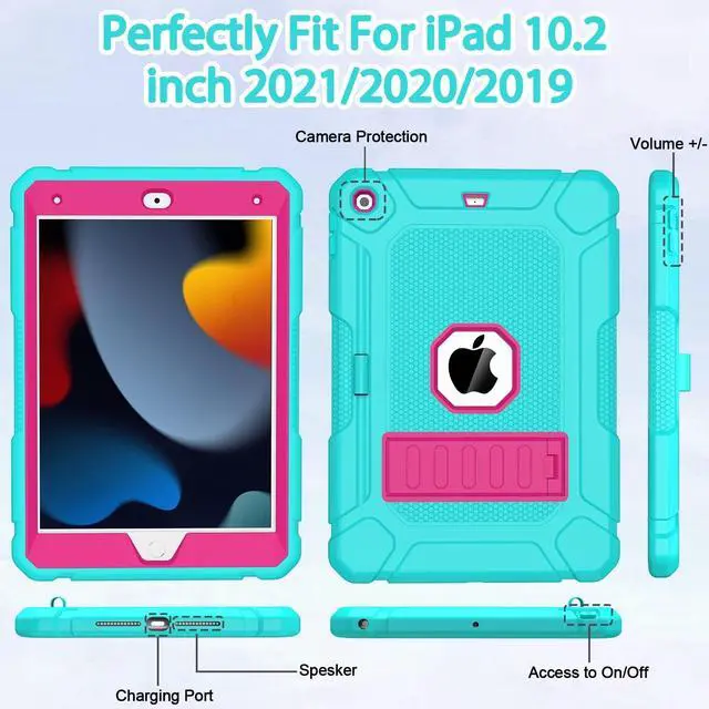 CompatibilityShockproof iPad 10.2 Case Only compatible with iPad 9th generation (A2602, A2603, A2604, A2605); iPad 8th generation (A2428, A2429, A2430, A2270); iPad 7th generation (A2197, A2200, A2198). NOT compatible with any other devices ^^ Military Grade Drop ProtectioniPad 9th 8th 7th generation case, made of hard PC and shockproof silicone, 3-in-1 layer full body protection construction which protects your iPad from scratches, drops and impacts.
