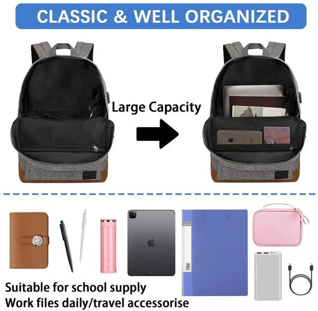 USB Charging Port & Power Bank PocketBuilt-in USB charging port and power bank pocket for convenient charging on the go. Keep your devices powered anytime, anywhere ^^ Water Resistant & Durable MaterialMade from high-quality water-resistant fabric, this backpack protects your belongings from rain and spills, ensuring durability for daily use ^^ Anti-Theft Design & Secure ZippersFeatures anti-theft design with hidden zippers and a back pocket to keep your valuables safe and secure during travel or commuting ^^ Ergonomic Design & Comfortable StrapsEquipped with padded shoulder straps and a breathable back panel for maximum comfort, even during long hours of wear ^^ Large Capacity & Multi-Compartment DesignSpacious main compartment fits laptops up to 17.3 inches, plus multiple pockets for books, clothes, and accessories.