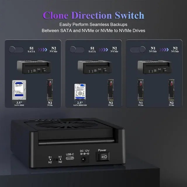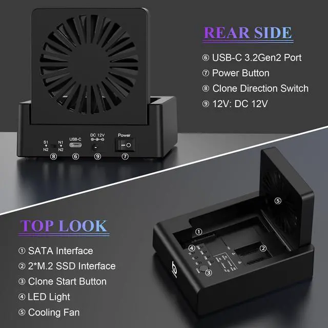 Note: Not compatible with SATA (NGFF) or mSATA SSDs. ^^ High-Speed Data TransferThe ssd cloner with USB 3.2 Gen 2 Type-C, enjoy transfer speeds up to 10Gbps. Supports 2.5" and 3.5" SATA hard drives with speeds up to 6Gbpsideal for fast file backups and data access. ^^ Efficient & Quiet CoolingBuilt-in high-performance cooling fan quickly lowers drive temperature within 5 minutes, protecting your HDD/SSD from overheating during large file transfers or long use. This nvme heatsink ensures stable high-speed performance and extends device lifespanall with quiet operation, perfect for home or office.
