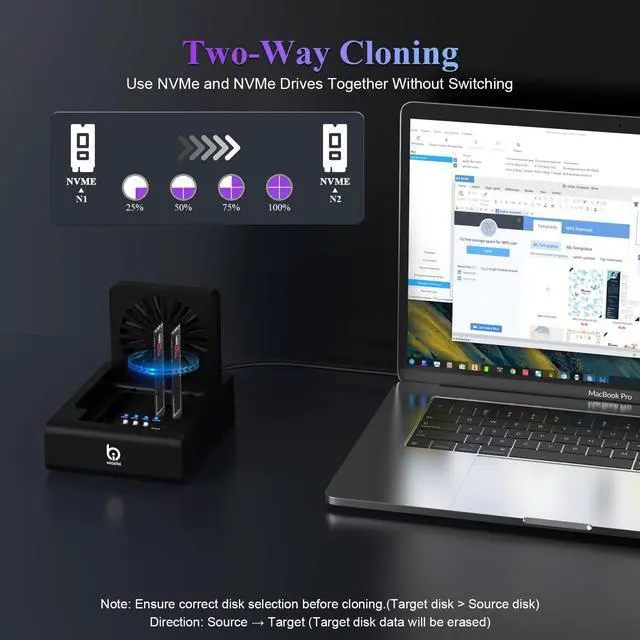 NOTE: Use a larger target drive and disconnect from PC during cloning. Make sure the target SSDs actual capacity is equal to or greater than the source SSD. If all four blue LEDs flash, it means the cloning has failed. ^^ Versatile CompatibilityEnjoy flexible drive combinations to suit all your storage needs. Whether you're using M. 2 NVMe SSD, 2.5" SATA HDD or 3.5" HDD, this m. 2 ssd cloner supports a wide range of combinations to meet your data transfer and backup needs. Easily connect up to two different types of drives simultaneously. ^^ Supported NVME & 2.5 / 3.5 SATAThis ssd docking station compatible with M. 2 NVMe (M-Key/B+M Key) and 2.5" / 3.5" SATA drives.