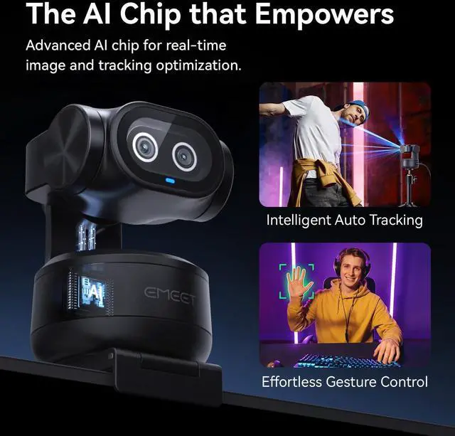 Built-in AIGC creates shot lists and movements. The PIXY podcast camera also has remote (ASIN: B0FP281Z19) adding hands-free control. ^^ 3-Mic Array for Multiple Scenes - EMEET PIXY PTZ camera uses a triple-mic array for crystal-clear sound. Live Mode filters steady noise like fans&AC for smooth live streams. Noise Canceling Mode blocks both steady hums and sudden sounds like keyboard clicks or door slams, designed for podcasts, courses, and recordings. Original Sound Mode captures full ambient detail for music and singing. With multiple recording modes, PIXY streaming webcam achieves studio-grade versatility without extra mics.