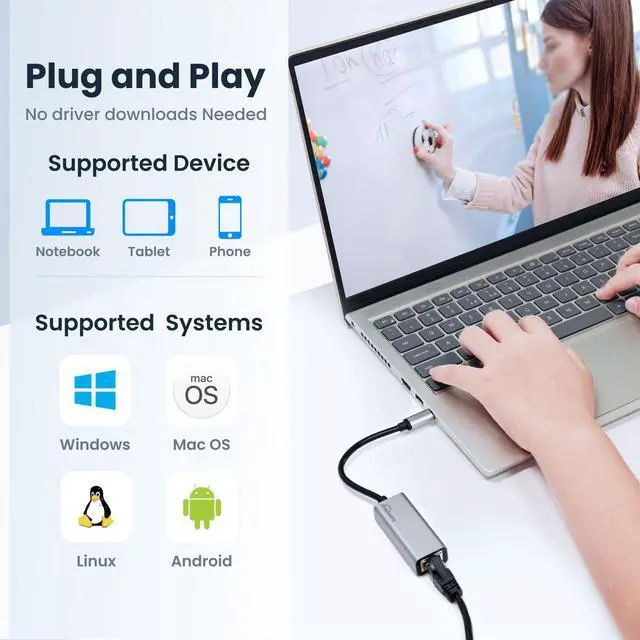Play & Excellent stability: The Ethernet to USB C Adapter is is no additional driver required, the USB C to LAN Adapter is driver-free for Windows 11/10/ 8.1 /8, macOS, iPad OS, Chrome OS, Linux, and Android Systems., Just plug in and enjoy. The built-in advanced IC chip ensures stable operation between RJ45 Ethernet cables and TypeC devices ^^
