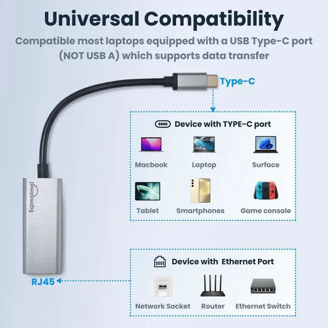 Wide Compatibility: Our Lan to typec Adapter compatible with most USB C devices, It is Nintendo Switch Ethernet adapters (most USB Ethernet adapters on the market don't support Nintendo consoles), compatible with most desktop computers, laptops with typec ports such as MacBook Pro 2019/2018/2017, MacBook, iPad Pro 2018/2019, Mac OS and Chrome OS, support Windows 10/ 8.1 /8, and gaming consoles devices such as Nintendo Switch, and Steam Deck, Playstation5 with USB-C or Thunderbolt 3 port (Compatible models can be found at the bottom of the detail page) ^^ Portable aluminum shell/reinforced connect design/Two indicators: Made of premium anti-fingerprints aluminum shell, makes this USB to Ethernet Adapter for laptop durable to use, keeping you away from a cheap and fragile plastic look. Two indicators are designed for status display and problem diagnosis