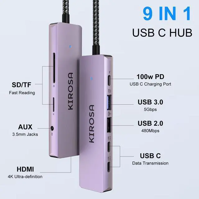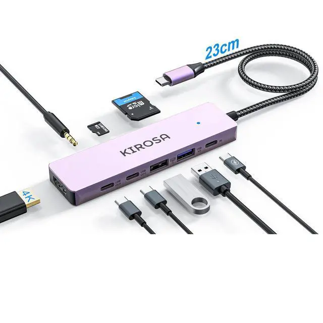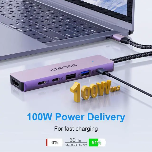 & USB-C x2: KIROSA usb c hdmi hub offers up to 5Gbps data transmission speed. The four USB/USB C ports allow you to simultaneously connect mouse, keyboard, external hard drive, and other accessories, streamlining your workflow. *To transfer data at maximum speed, your devices must all support USB 3.0. ^^ 100W PD & 23cm
