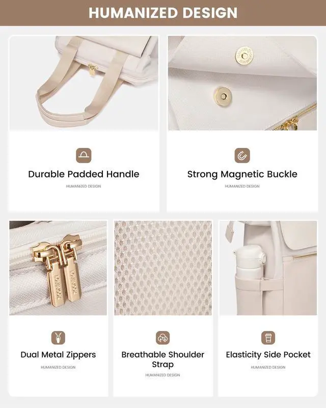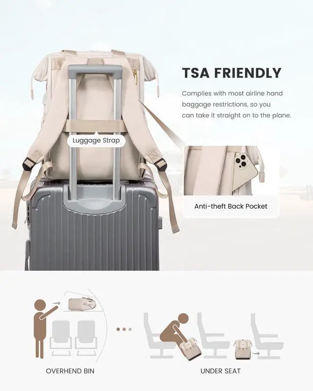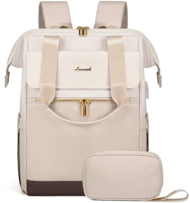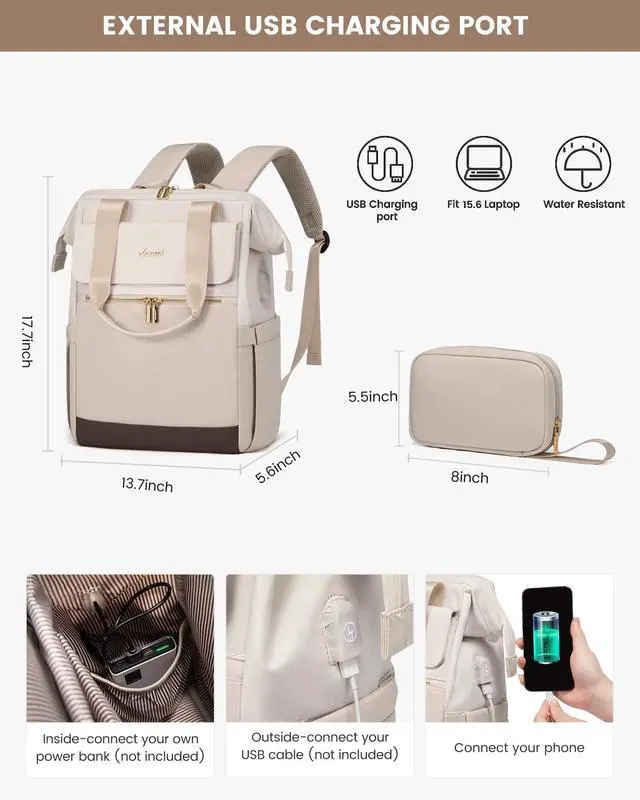 Large Capacity Work BackpackSize 17.7 * 13.7 * 5.6 inch. One womens backpack to solve all daily troubles. Work bag has multiple divider pockets, easy to organize all work supplies as 15.6" laptop, 11" ipads, Phone, binder, water bottle, umbrella and so on. ^^ Free Cable Organizer BagComes with a $10 organizer travel case.