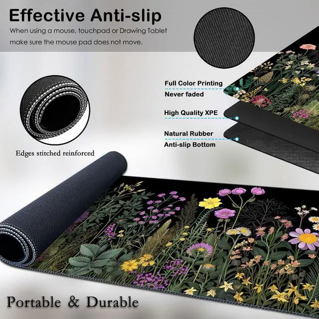 3-in-1 Mouse Pad Set, a perfect blend of functionality and style to enhance your workspace. The desk pad, measuring 23.6 x 11.8 inches, offers ample space to accommodate your mouse, keyboard, headphones, game controller, drawing tablet, phone, and tablet. This comprehensive set not only organizes your essentials but also maintains a clean and professional desktop appearance. Our ergonomically designed mouse wrist pad features built-in soft silicone, delivering an excellent hand feel. It alleviates discomfort from prolonged mouse use and prevents wrist joint pain. The Semi-adhesive PU anti-slip bottom ensures stability, even during rapid mouse operations.