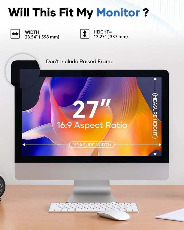 Protection Film SizeWidth: 23 inches ( 23.54 inches/598 mm), height: 13 inches ( 13.27 inches/337 mm) - 16:9 aspect ratio. This computer privacy protection film can be seamlessly adapted. Support most mainstream models on the market. In order to ensure the best user experience, it is recommended to carefully measure the width and height of the screen before placing an order. If you have any questions about the size, please contact us. It is not recommended to choose the size only according to the diagonal. ^^ Enhanced Privacy ProtectionDMFXNBLM 27 inch computer privacy filter can ensure the security of your electronic information in your daily work and study, which is very suitable for use in public. The 27 inch computer privacy screen adopts advanced micro-blind design technology, which can completely cover the screen at about 26 degrees. Protect the screen privacy of your computer monitor and no longer disclose any confidential data. ^^ Protect Eye HealthDMFXNBLM 27 inch monitor privacy screen can block 95% of blue light and 98% of ultraviolet light, and filter all harmful light emitted by the screen to minimise the potential harm to eyesight and take care of your eyes. As a double-sided spy film, the matte surface can provide a clearer field of view and better privacy, while the matte surface can minimise glare and interference reflection.