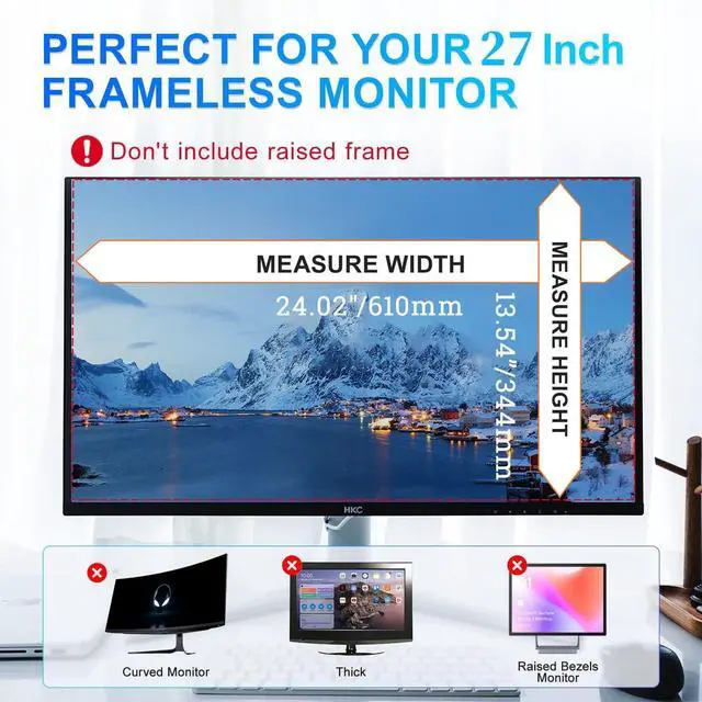 Flawless Visual Experience]: Our computer privacy screen 27 inch achieves near-perfect edge-to-edge adhesion with zero gaps, zero ghosting, Width: 24.02 inches/610 mm, Height: 13.54 inches/344 mm - 16:9 Aspect Ratio. Fits brands like HP, Asus, Samsung, Dell, LG, Acer, ViewSonic and other frameless 27-inch monitors. Please measure the width and height dimensions of your computer screen before ordering (excluding the bezel). If you have any questions, please contact us ^^ [Dual Defense -