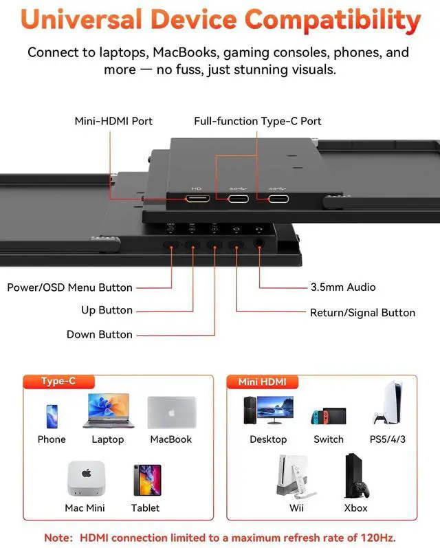 Professionals get a serious productivity boost with dual screens using this portable computer monitor, while gamers enjoy a more immersive visual gaming monitor experience. Transform any spacehome, office, or travelinto your perfect work or entertainment hub. ^^ Universal Plug & Play CompatibilityConnect instantly via two Full-Function USB-C ports (video + power) or Mini-HDMI. This portable travel monitor works seamlessly with laptops, MacBooks, PCs, phones, tablets, Switch, PS5/PS4/PS3, Xbox, and more.