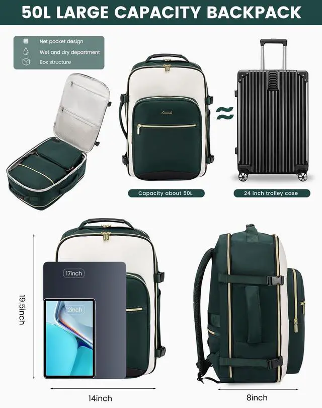 Perfect Domestic Travel CompanionThe Colorful Design Travel Backpack - 50L is USA flight-friendly, sleek, and practical. Ideal for Spirit, Frontier, Easy Jet, Jet Blue. Fits overhead or under seats, ensuring a carefree journey. ^^ Smart Organization for On-the-GoStylish yet practical, this carry on backpack with 4 main compartments, multiple internal pockets and wet clothes pocket keeps you organized on 7-9 day trips. Includes attached 1 shoe bag and 2 multipurpose pouches for hassle-free packing. ^^ Practical & reliablePraised for spacious design, durability, and comfy straps.
