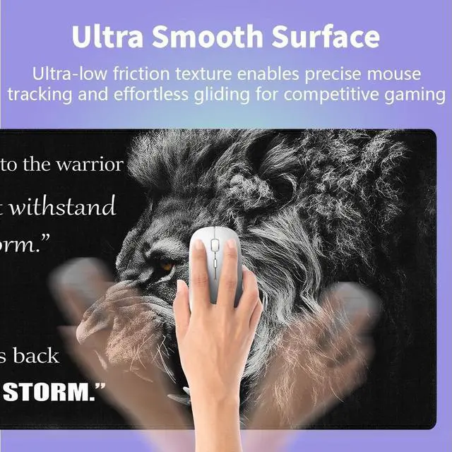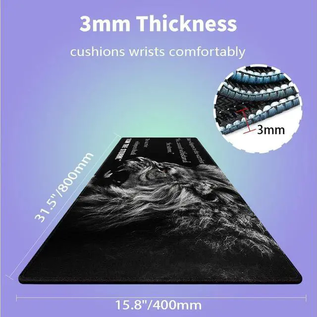Ultra-Large Size ( 31.5" x 15.8" )Perfect for gaming setups or workspaces, covering your desk and providing ample room for keyboard, mouse, and accessories. ^^ 3mm Thick & ComfortableCushioned thickness ergonomic wrist support reduces fatigue during extended computer sessions, smooth fabric surface reduces wrist strain. ^^ Natural Non-slip Rubber BaseEco-friendly anti-slip grip keeps mat firmly in place during intense use. ^^ Ultra-Smooth Fabric SurfaceOptimized fabric surface ensures precise mouse tracking & low friction for both work and speed gaming. ^^ Stitched Edges for DurabilityExtra-large desk mat with premium stitched edges to prevent fraying, it's a long-lasting gaming mouse pad/desk mat.