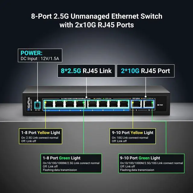 Plug and Play: Supports 10/100/1000M/2.5G auto-sensing on ports 1-8, with auto MDI/MDIX and non-blocking data forwarding support, easy to set up without any configuration or software, providing the best performance for all your devices. This switch provides 2x10G RJ45 ports for high-speed network connections, providing a cost-effective solution for adding 10G link capacity.