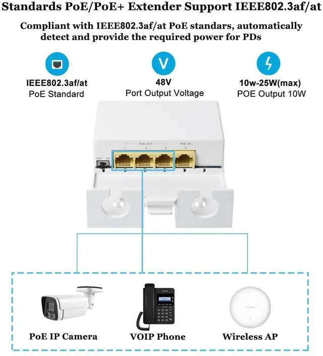 Note: 1. This Extender is not a PoE Switch, it can not work without powered from PoE Switch/PoE injector/PoE NVR. 2. Please don't place any heavy thing on the PoE extender;