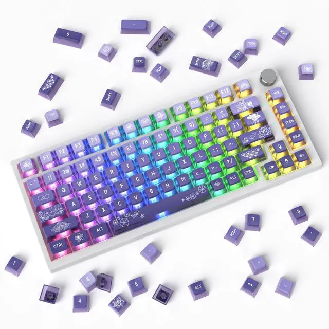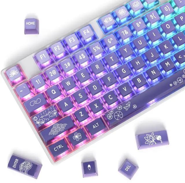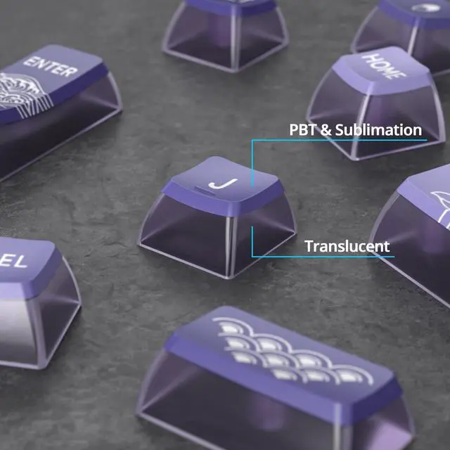 PBT & Dye-Sublimation KeycapsMechanical keyboard keycaps are made of high quality PBT keycaps and oil repellent coating. Greatly improve the durability and practicality of the keycap. ^^ Comfortable ASA Profile KeycapsErgonomic comfort allows you to use stress-free. Give you the highest comfort when using. It is not easy to fatigue after long-term use and has better comfort. ^^ Two-color stitching & Translucent DesignThe translucent layer design of these custom keycaps is designed to let more light through, making your mechanical keyboards RGB backlit even more stunning. The surface has a slightly frosted feel ^^ Styles of Personalized Complement keysWhen you are tired of a color style, you can change several of the keycaps to change your keyboard to a new style.