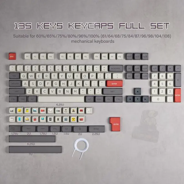 ^^ Wide CompatibleThis keyboard keycaps consists of 135 keycaps, including 104 standard keys and 31 supplementary keys. The retro gaming consoles keyset is compatible with the ANSI and ISO layout mechanical keyboard that using the most switches in the market that has