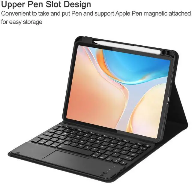 Note: Please Upgrade your tablet software to iPad OS 13.4 to fully access to the touchpad function. ^^ Magnetically Detachable KeyboardThis iPad 10th/A16 11th gen case with keyboard is magnetic so it can be easily repositioned or removed from the case. The case has 3 grooves to adjust the viewing angle as you like, make your ipad stand steadily. You can adjust to the optimal angle for studying, working, or entertaining. ^^ Convenient Pencil HolderThe iPad 10th/A16 11th generation keyboard case designed with pencil holder and pen slot on top to place and take the pen easier, and support Apple Pen magnetic attached for easy storage.