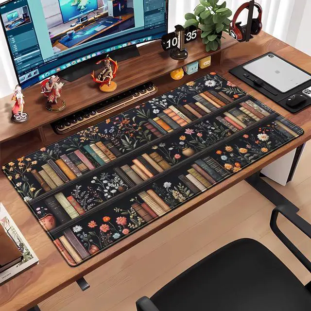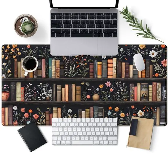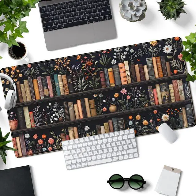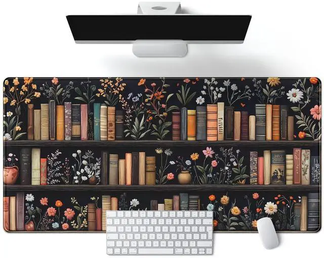 Bookish Desk Mat Floral Bookshelf Desk Pad Faux Embroidery Large Mouse Pad XXL Book Lovers Gift Extended Gaming Mousepad Flower Aesthetic Keyboard Pad Mouse Mat 31.5x15.7 in Office Decor for Women