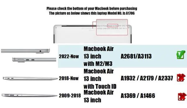 Models: A3240 (M4 2025) /A3113 (M3 2024) /A2681 (M2 2022). Verify "A1xxx" on device underside before purchase. ^^ NOT compatible with MacBook Air 13.3 Inch M1 Model A2337/A1932/A2179(2018-2020 Ver. ) nor Macbook Air 13 inch( 13.3 ) Model A1369/A1466 Old Version 2010-2017. ^^ High Quality Hard Shell Case for original touch protect your MacBook, strong and durable material against shock, scratch, fingerprint, dusty and other damage, thin and light design will not increase excess volume. ^^ Easy to put on and take off and Plug your charger, cable or headset without removing the protective case. Air-follow through ventilation areas for heat release, Rubberized feet to keep your MacBook firmly in place ^^ 2 in 1