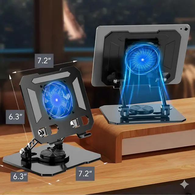 Ergonomic Height for Better Neck Posture This laptop stand gently raises your screen to a healthier viewing levelhelping reduce neck tension, support proper posture, and create a more comfortable long-term desk setup. A smart choice for those concerned about cervical spine pressure during extended screen time. ^^ Efficient Cooling with Dual Turbo Fans Dual-turbo fans (or single-fan version) provide powerful and quiet airflow, actively dissipating heat to keep your laptop cool during gaming, editing, or long meetings. Maintain device performance while reducing noise and thermal stress. ^^ 360 Rotation + 180 Adjustable Tilt The stand features a 360 rotating base and 180 adjustable tiltallowing precise angle adjustments for typing, video calls, or drawing.