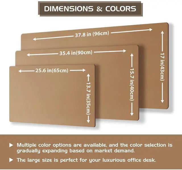 Colors and Sizes: Available in a range of colors and sizes, our desk pad can seamlessly blend into diverse office and home environments, catering to individual needs and preferences. Size of 25.6" x 13.7", 35.4" x 15.7", 37.8" x17", thickness 0.08 inches, thick enough to provide soft and elastic touching; large enough to accommodate your laptop, mouse, keyboard and journal ^^ Protection and Easy to