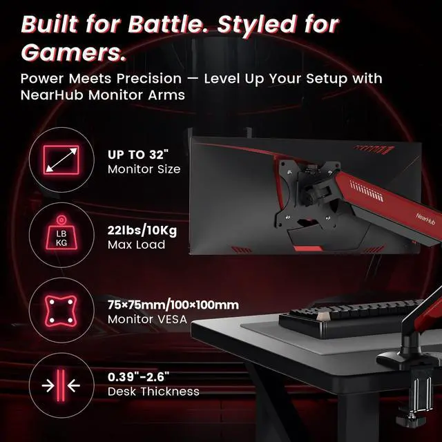 Durability: Stability is crucial for gamers, NearHub monitor arm utilize gas spring technology tested for 30, 000 cycles, enabling smooth adjustments and long-term durability, stays stable even during intense gaming sessions, providing reliable support, preventing shaking and unwanted movement. ^^ Optimal