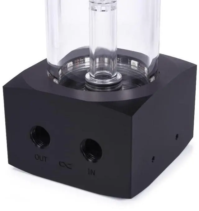 The Alphacool Core reservoir combines performance with design. The tube of the reservoir is made of acrylic, the D5/VPP pump top and the lid of acetal. The combination of these two materials gives the expansion tank a discreet appearance. The wow effect is provided by 12 digitally addressable RGB LEDs in the pump top and the Lighttower water effect inside the acrylic tube. Extensive mounting options