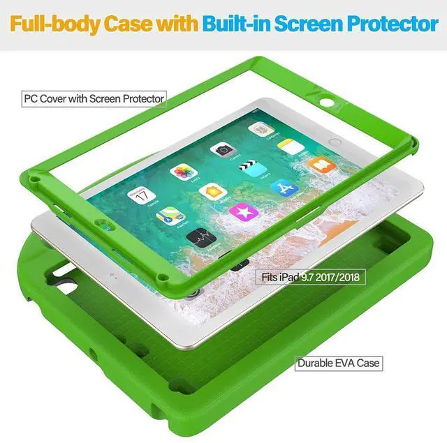 Pro 9.7 (Model number: A1474 A1475 A1476 A1566 A1567 A1673 A1674 A1675 A1822 A1823 A1893 A1954), check the back of your iPad to find out the model number. ^^ Full-body ProtectionMade of durable, kid-safe, lightweight and shock-absorbing EVA material, protects your iPad from bumps and drops. ^^ Built-in Screen ProtectorBuilt-in a clear screen protector prevents scratches and dirts without compromising sensitivity. ^^ Built-in StandBuilt in a foldable kickstand, it can convert into a stand for comfortable typing and hands-free viewing. ^^ Precise OpeningsCustomed cut-outs for buttons, ports and cameras, easy access to all features without removing the case.