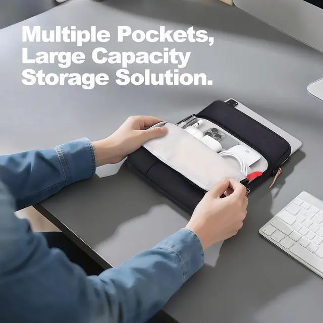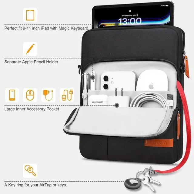 Storage Ways: A special Red Key/AirTag Ring, which can be used to store keys or Airtag to prevent loss. This iPad Sleeve Bag has tailored tablet compartments and front Large-opening zippered pockets. Not only will your iPad Pro be carried easily, but all your extras too (tablet accessories or otherwise) like cables, pens, phones, external battery pack, headphone, tissues, and so on. Also has the Apple Pencil slot and card slots.