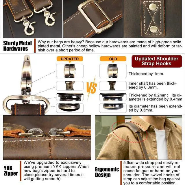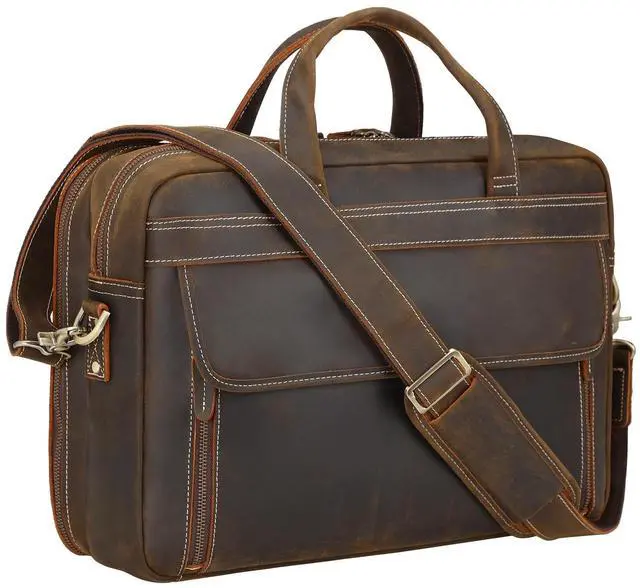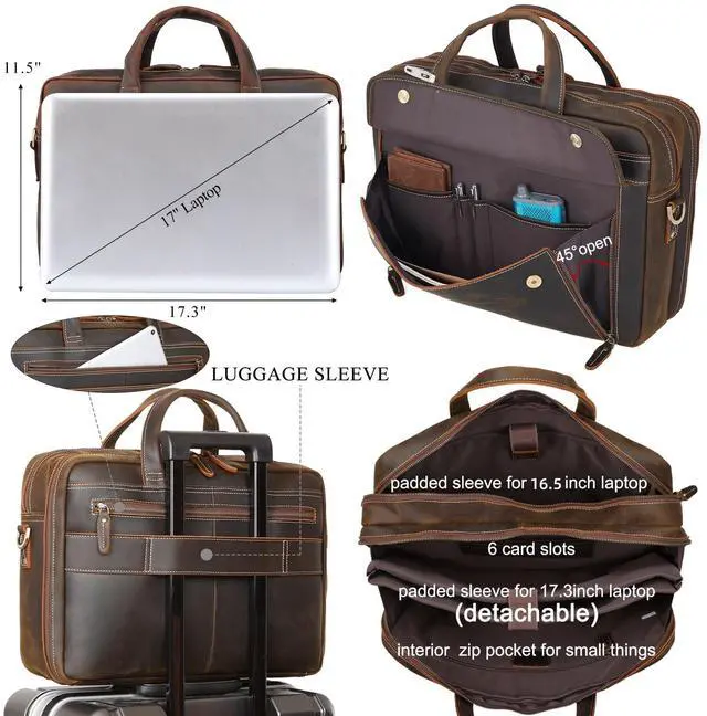 Quality Material Made of 2mm thick full grain cowhide leather processed with crazy horse leather technology, this messenger bag is featured with outstanding durability and weathered vintage look. The leather grows brighter and shiny and looks " newer" with age. That's why many people become followers of crazy horse leather bag. Delicate stitches, ykk metal zippers and heavy duty hardware ensures its long usage time ^^ Roomy Storage - Carry 2 LaptopsThe fasten padded sleeve fits 16.5 to 17" laptop; the removable sleeve fits most of 17.3 laptop, clothes, tablet, A4 documents, conference files, notebook; inner pockets for business cards; slots for pens;