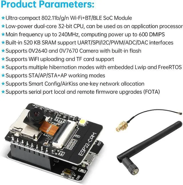 Easy to use: for ESP32-CAM-MB is a small camera module, with on-board PCB antenna, convenient connection. With the built-in development card and TF card slot, it is easy to set up your project and start working.