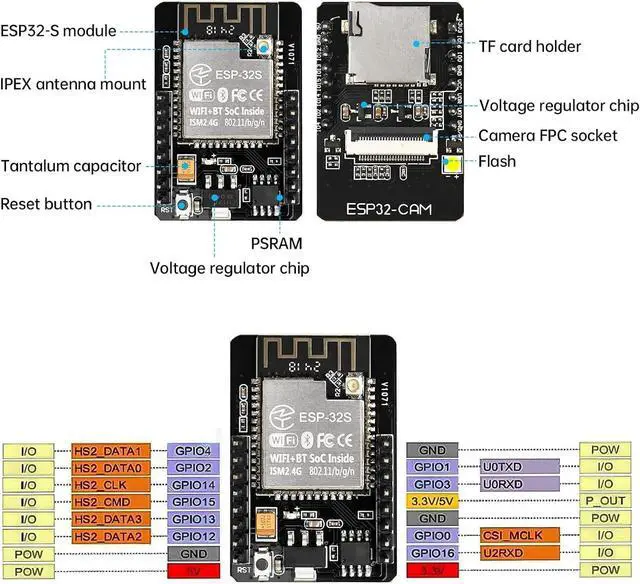 ^^ Flexible extension: ESP cam supports UART/SPI/I2C/PWM/ADC/DAC and other interfaces. Supports OV7670 and OV2640 cameras, built-in flash.