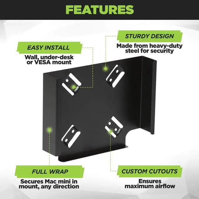 US PATENTED DESIGN. The HIDEit Apple Mac mini Mount is wall and under-desk mountable or VESA mount your Mac mini to the back of your monitor. Its sleek design ensures full access to ports and cables. ^^ STEEL FOR ULTIMATE STRENGTH. Our wall mount for Mac mini is made from 16-gauge, cold-rolled steel for strength you can trust. The black powder-coat finish wont rust or chip and protects your Mac mini from scratches. ^^ KEEP YOUR MAC MINI SAFE. Protect your Apple Mac mini and mount it away from kids, spills and other accidental damage.