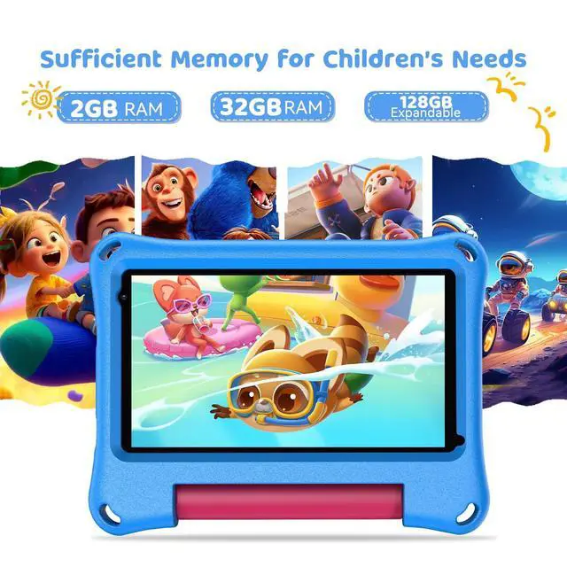 ^^ Large-capacity Storage TabletThe qunyiCO tablet has 2GB RAM, 32GB internal storage + expandable storage up to 128 GB. Performance has been greatly improved to ensure comfortable operation. qunyiCO Y7 tablet for kids enables you to download cartoons, videos, games and Apps when Wi-Fi is connected.
