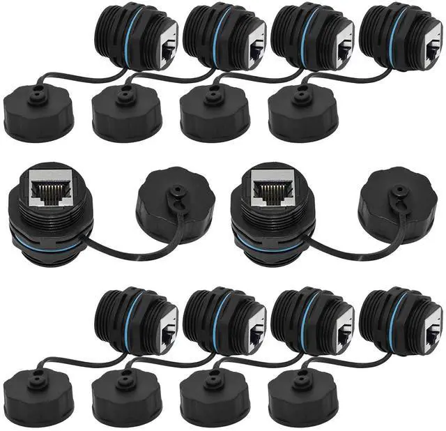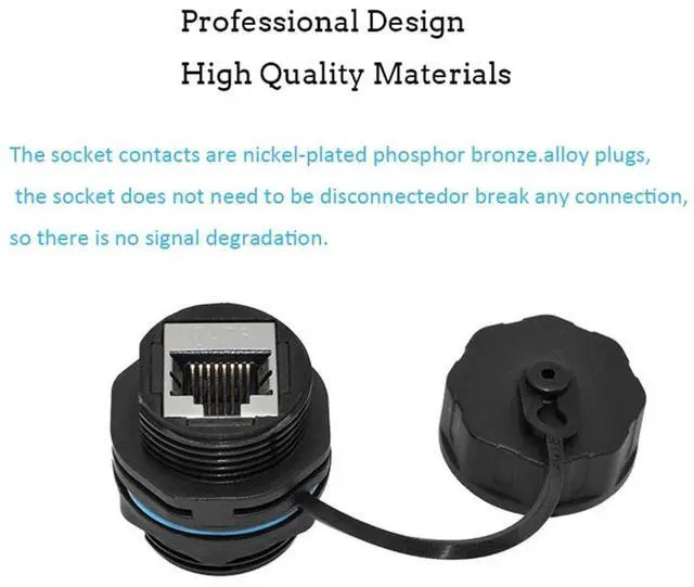 RJ45 CAT6 Connectors Provides feed-through CAT6 Ethernet connectivity for data and PoE in industrial environments. ^^ IP68 WATERPROOFThe panel mount RJ45 connector has a waterproof cover, rubber ring provides superior water resistance and sealing. ^^ HIGH QUALITYNylon PA66 shell, highly flame retardant. Gold-plated interface, anti-oxidation, more durable. ^^ EASY INSTALLTIONThe Shielded Industrial Panel Mount is a Female/Female Coupler, plug and play, threaded connecting design, no soldering and no need to damage or interrupt the original wire, no signal degradation. ^^ MULTI-APPLICATION Waterproof RJ45 connectors can be used in environments where wall penetration is required and are ensured to be waterproof, it is very much ideal for printers, PCs, routers, computer servers, switch boxes, network media players, Gaming, POE device.