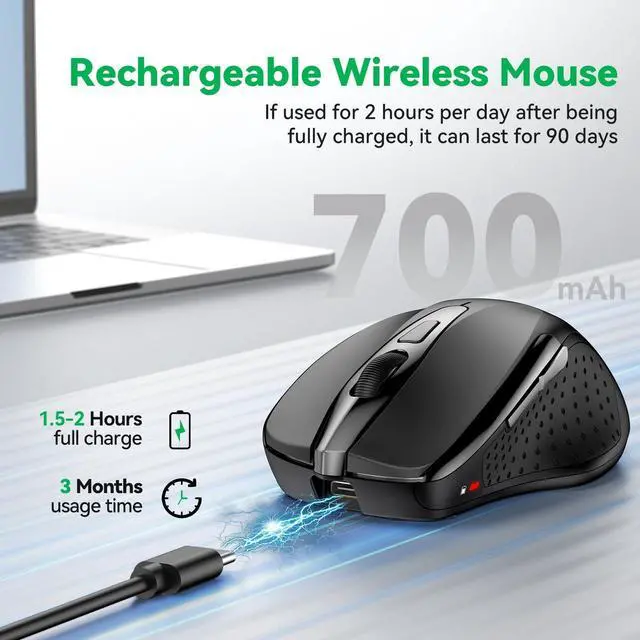 • Rechargeable Mouse with Low Battery WarningSay goodbye to the hassle of constantly changing batteries. TechRise bluetooth mouse for laptop requires just a quick 1.5 to 2-hour charge for up to 3 months of usage (based on 2 hours of daily use). The laptop mouse goes into sleep mode after 8 minutes of inactivity and can be easily awakened by a click. When the battery is low, the LED light w