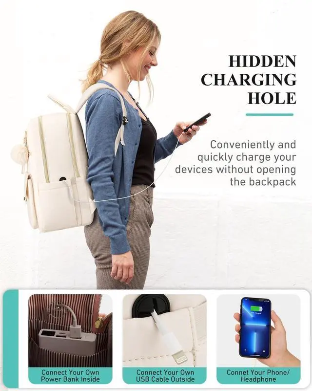 Charging Easily: Design with a charging hole. Offering you a more convenient way to charge your phone while walking. You can charge the phone via the side pocket's hole so that you dont need to take the portable charger all the time. Just keep your phone powered up on the go. Please noted that the backpack can not power itself, charging hole only offers an easy access to charge ^^