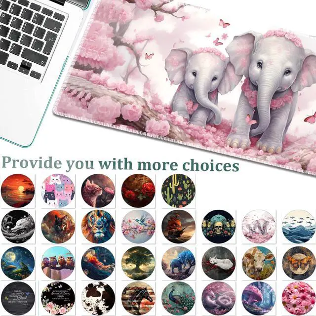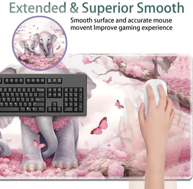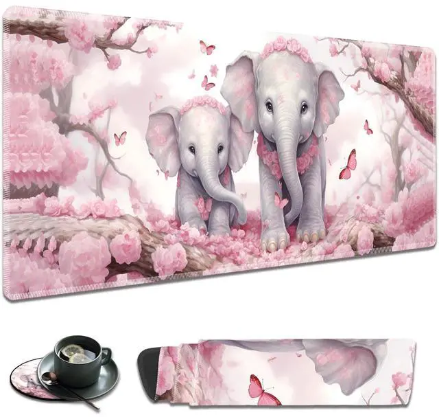 Large Gaming Mouse Pad Non-Slip Keyboard Pad Soft Extended Desk Mat Desktop Writing Pad (31.5"11.8") Combined with Coasters, Home and Office Desktop Decor, Elephants Under Cherry Blossoms