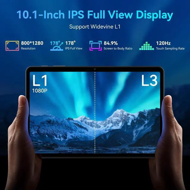 HD Display & Widevine L1: Your Portable Cinema] Dive into a vibrant visual experience on the 10.1 -inch HD (1280x800) display. Enhanced by dual stereo speakers, movies and games come to life with rich, immersive sound. Certified with Widevine L1, enjoy your favorite content on YouTube, and Prime Video in true High Definition, free from pixelated streams ^^ [Android 15