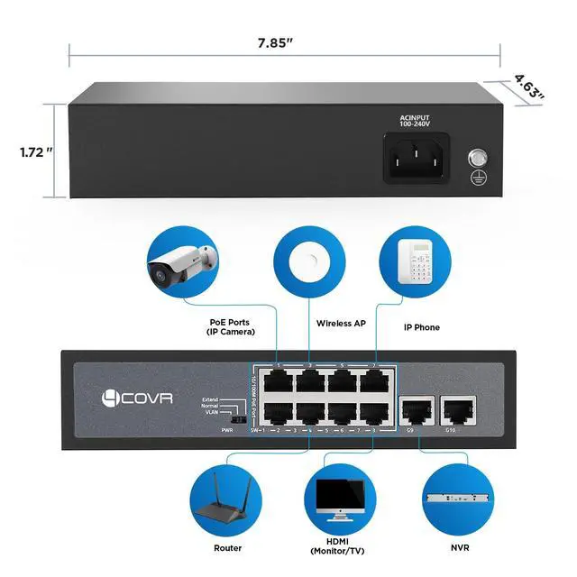 Dimensions: Standard rack-mountable size Ensure your network is ready for the demands of modern IP surveillance with the 4COVR 8 Ports 120W Ethernet PoE Switch. Its robust features and reliable performance make it the perfect choice for both small and large-scale security systems.