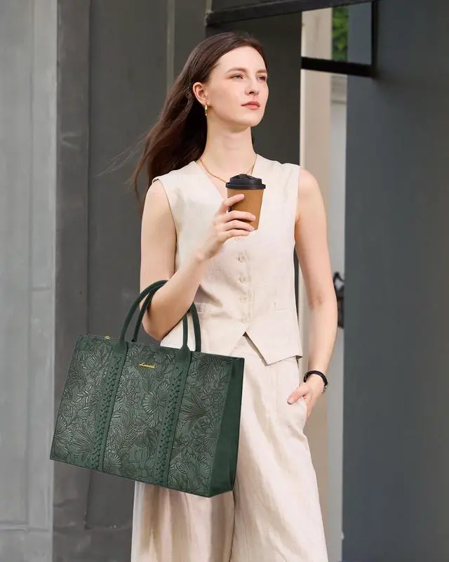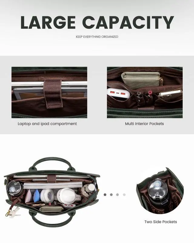 Perfect Size Laptop Bag: Measuring 16.3" x 6" x 12", this multi-pocket leather tote bag boasts ample space with a thick padded laptop compartment (For 13"/14"/15"/ 15.6" laptops), tablet slot, and various pockets for great organization, ensuring a secure and organized commute, daily use or business trip. Designed for the professional modern woman, the leather laptop bag for women marries elegance with functionality. ^^