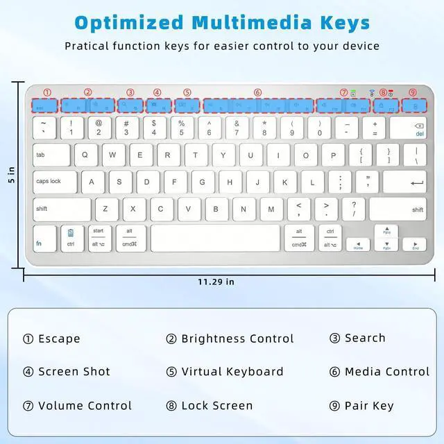 Note: The mini Bluetooth keyboard enabled to support up to 1 devices at the same time. ^^ It is easy to pair with your device by Bluetooth. The working distance is up to 33 feet. This Bluetooth keyboard work with all your Bluetooth devices such as tablets, mobile phones and laptops, etc. It could automatic recognize the system, you needn't press any specific function keys. ^^ Designed with unique mechanical scissor keys, the Bluetooth keyboard for iPad are highly resilient and noiseless, providing you with a fluid and comfortable typing experience. Ergonomic design provides a comfortable posture angle for your wrist while typing. This mini Bluetooth keyboard type fast and instant access your music, brightness, search, volume, etc by multi-media hot keys. ^^ The keyboard does not compatible with iMac, Windows 7, Windows XP, Windows Vista system. ^^ - The keyboard requires charging via a USB Type C cable, quite convenient and quick charging. No need to replace the battery anymore, charge for 3-4 hours and last for 100 hours or more. ( Only a USB A to Type C cable comes with.