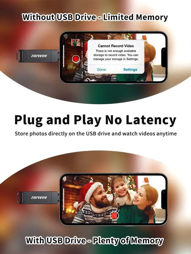 (Note: Requires iOS 13 or higher for iPhone; Android devices must support OTG) ^^ Play Videos, Photos, and Music DirectlyStore your favorite media on the flash drive and enjoy seamless playback on your iPhone or iPad, anytime, anywhere, no internet connection needed. It supports a wide range of video and image formats, making it the perfect solution for organizing your digital library. ^^ Blazing Fast Transfer SpeedsTransfer photos, videos, and files in a flash! With read speeds up to 30 MB/s and write speeds up to 15 MB/s, our USB stick outperforms standard drives. Edit on the go without buffering or lag, and enjoy a smoother workflow.