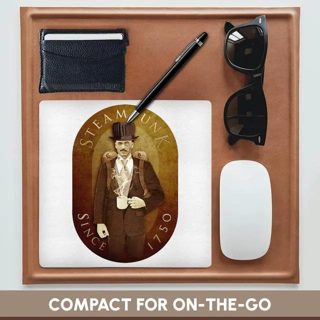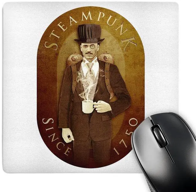 Steampunk Mouse Pad is 8" x 8" x. 25" and is made of heavy-duty recycled rubber. Matte finish image will not fade or peel. Machine washable using a mild detergent and air dry.