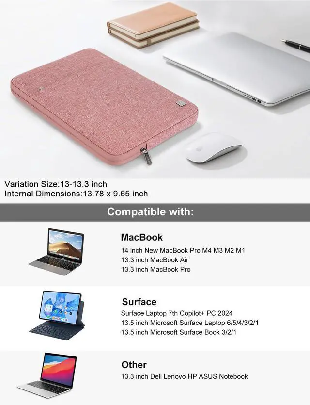 INTERNAL DIMENSIONS: 13.4 *10* 1.0 inches; Perfectly fits 14-inch New MacBook Pro M4/M3/M2/M1 Pro/Max A3112 A3401 A3185 A2992 A2918 A2779 A2442 2024-2021; 13.5 -inch Surface Laptop 6/5/4/3, 13.8 -inch New Surface Laptop 7th Edition, Copilot+ PC 2024. Also compatible with 13-inch Surface Pro 11(Copilot+PC)/10/9/8/X with Surface Pro Flex Keyboard, and most 13- 13.3 inch laptops notebook from Dell, Acer, Lenovo, HP, Asus.