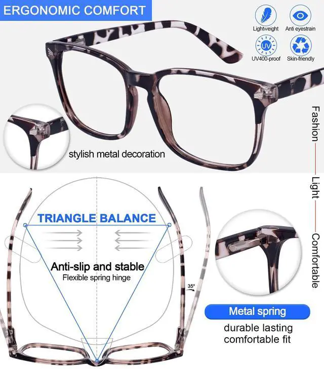 ^^ Comfortable fit: The lightweight and colorfast computer readers with designer metal decoration will make you more stylish to become a fashion lady. With flexible spring hinge wont pinch your face; sturdy metal spring is more durable and not easily damaged. Full ergonomic design with blue light protection give you a all-day comfy wearing.